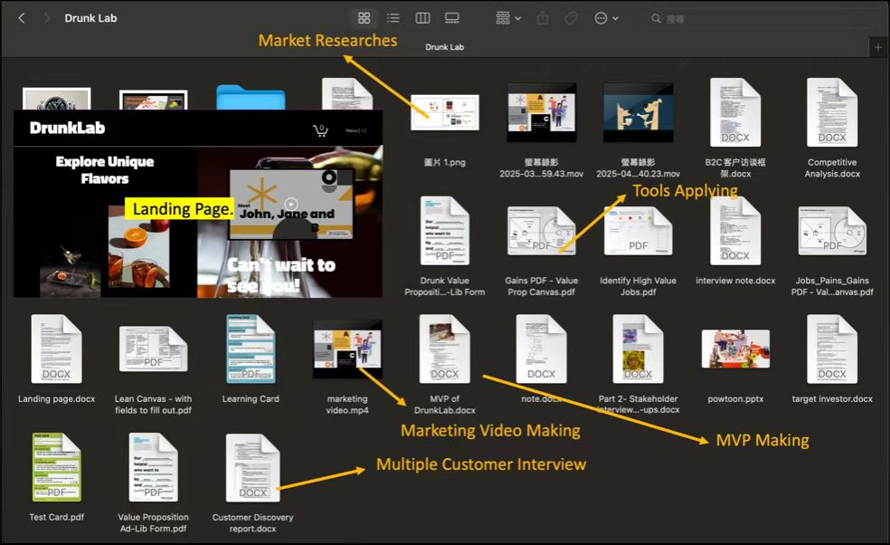 由于这门课时间跨度比较大,且需要极强的实操证据,我对这门课的情感是又爱又恨。我们三人小组的创业项目是鸡尾酒kit,目标针对调酒小白、朋友聚会等场合。从一开始较为理想碎片的雏形,我们经历了对身边同学、朋友进行采访,利用各种工具表格进行idea验证,夜晚在酒吧请教酒保,前往不同的店铺采购小包装基酒,完成网站设计、宣传片制作等工作,到最后能够呈现出一个完整的MVP并做pitch,结课的时候竟然真的对这个项目有一丝不舍。